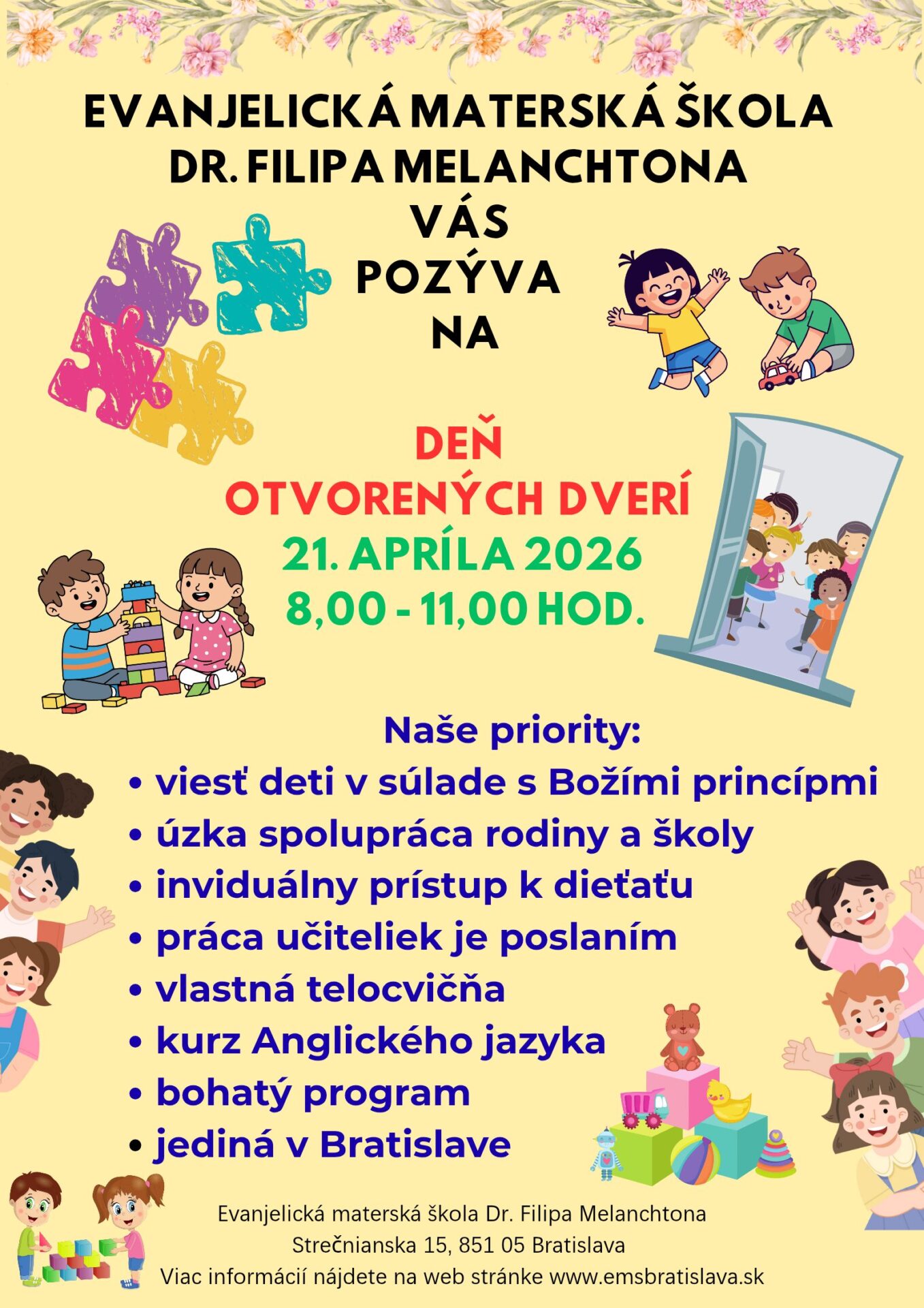 EVANJELICKÁ MATERSKÁ ŠKOLA DR. FILIPA MELANCHTONA VÁS POZÝVA NA DEŇ OTVORENÝCH DVERÍ 21. APRÍLA 2026 8,00 – 11,00 HOD. Naše priority: